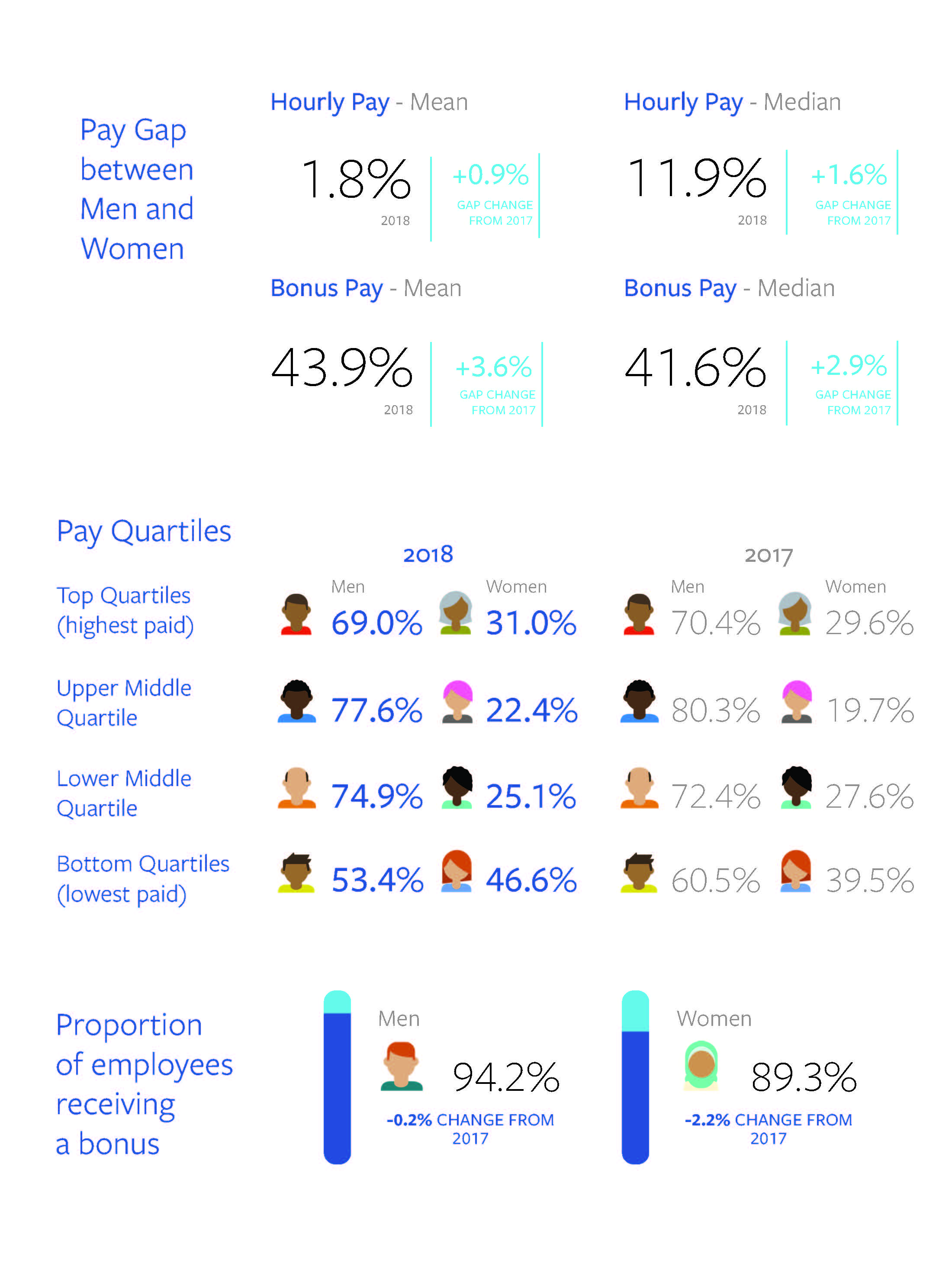 In April 2018, Facebook's UK mean gender pay gap is 1.8% and median gender pay